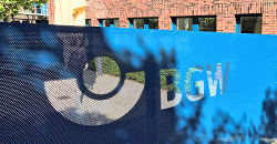 Sicherheit. Auf Firmengeländen vereint Fotoblech Sicherheit und ansprechendes Design. Das Beispiel zeigt ein Industrietor mit integriertem Firmenlogo, das durch Ränder mit kleinen Lochungen einen dezenten Rahmen-Effekt erhält. Edelstahl gewährleistet dabei hohe Festigkeit. Selbst bei seitlicher Betrachtung bleibt das Motiv sichtbar, und Sonneneinstrahlung erzeugt einen schimmernden Effekt, der das Design hervorhebt.
