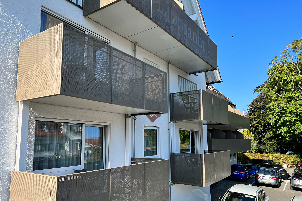 Integrated handrail. Fotoblech balconies often forgo a separate handrail and instead integrate it into the surface, resulting in a reduced, aesthetically flat appearance.